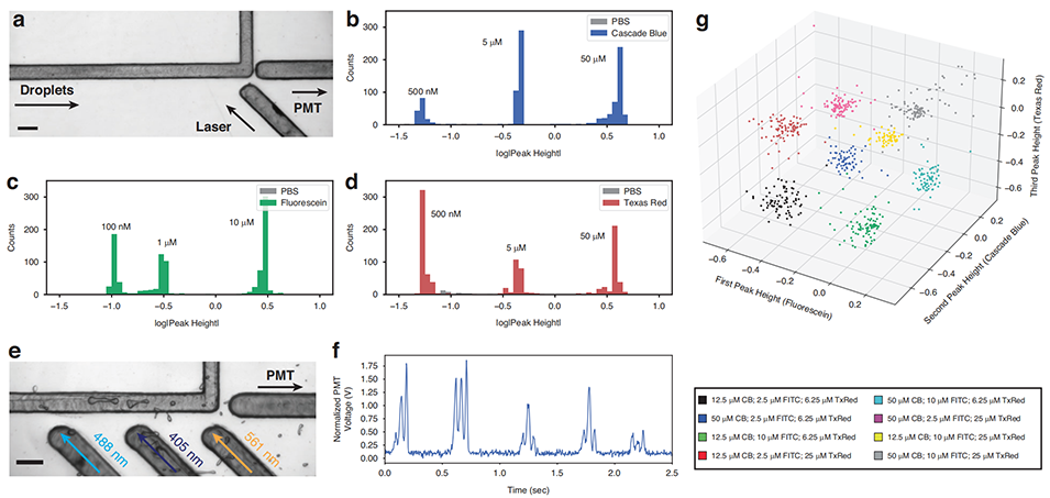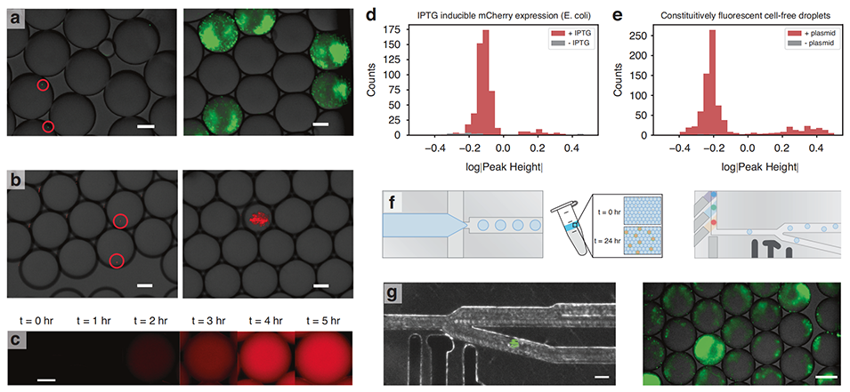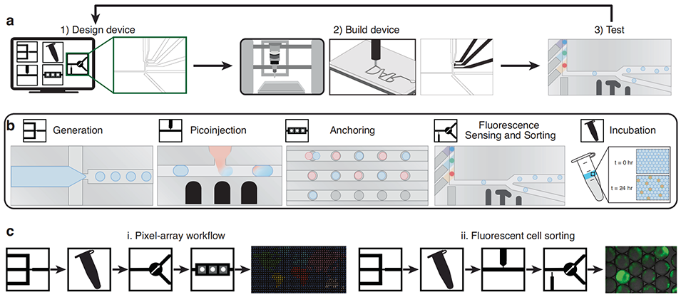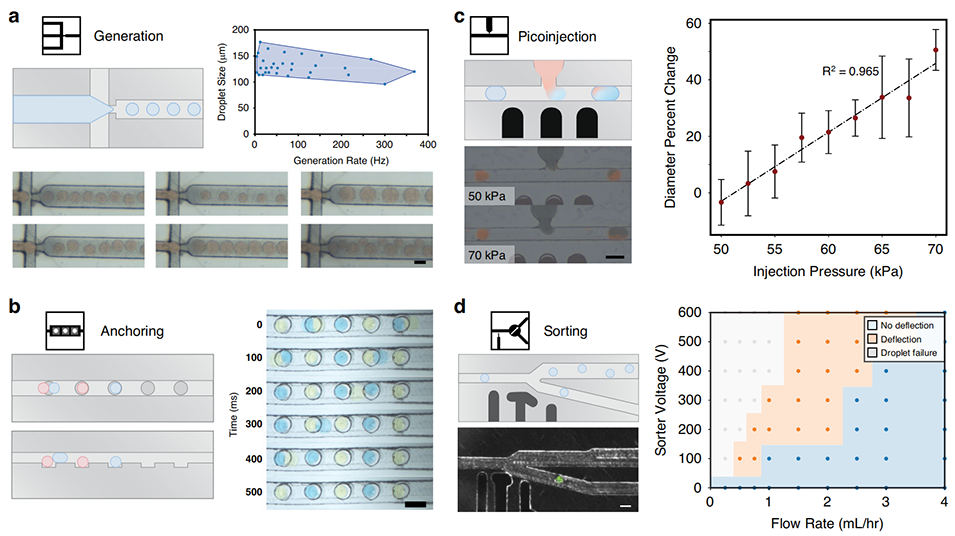 3、开发的组件包括液滴生成、再注入、锚定、皮升级注入、荧光传感及分选等功能模块,均具有良好的生物相容性与高通量性能。