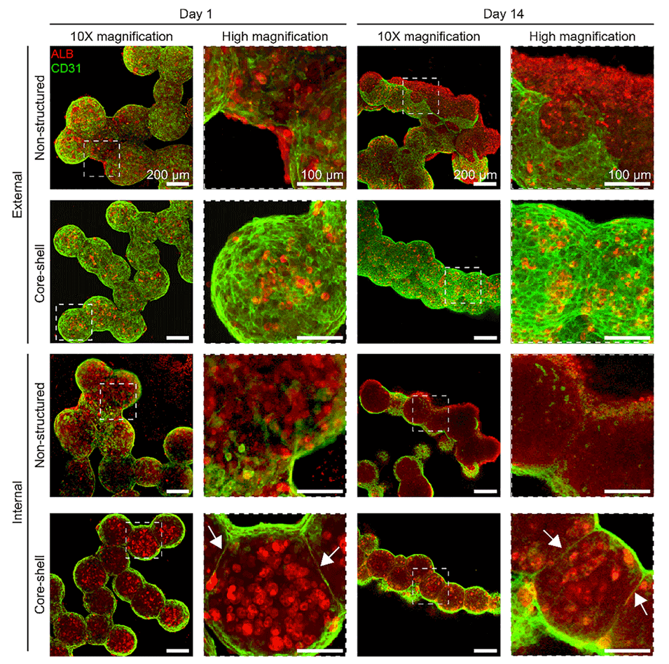 图3. 球状微组织聚集体的免疫荧光染色(展示第 1 天和第 14 天核-壳结构与非结构化球状体的结构对比)。可观察到二者在形态、稳定性及细胞排列上的差异。第一行和第二行分别为非结构化与核-壳结构球状微组织形成聚集体的表面视图;第三行和第四行为通过共聚焦显微镜拍摄的聚集体中部横截面视图。第二列和第四列是第一列和第三列中白色方框标注区域的放大图像。白色箭头指示核-壳结构球状微组织组中 HepG2/C3A 细胞与 EA.hy926 细胞之间维持的空间分离状态。