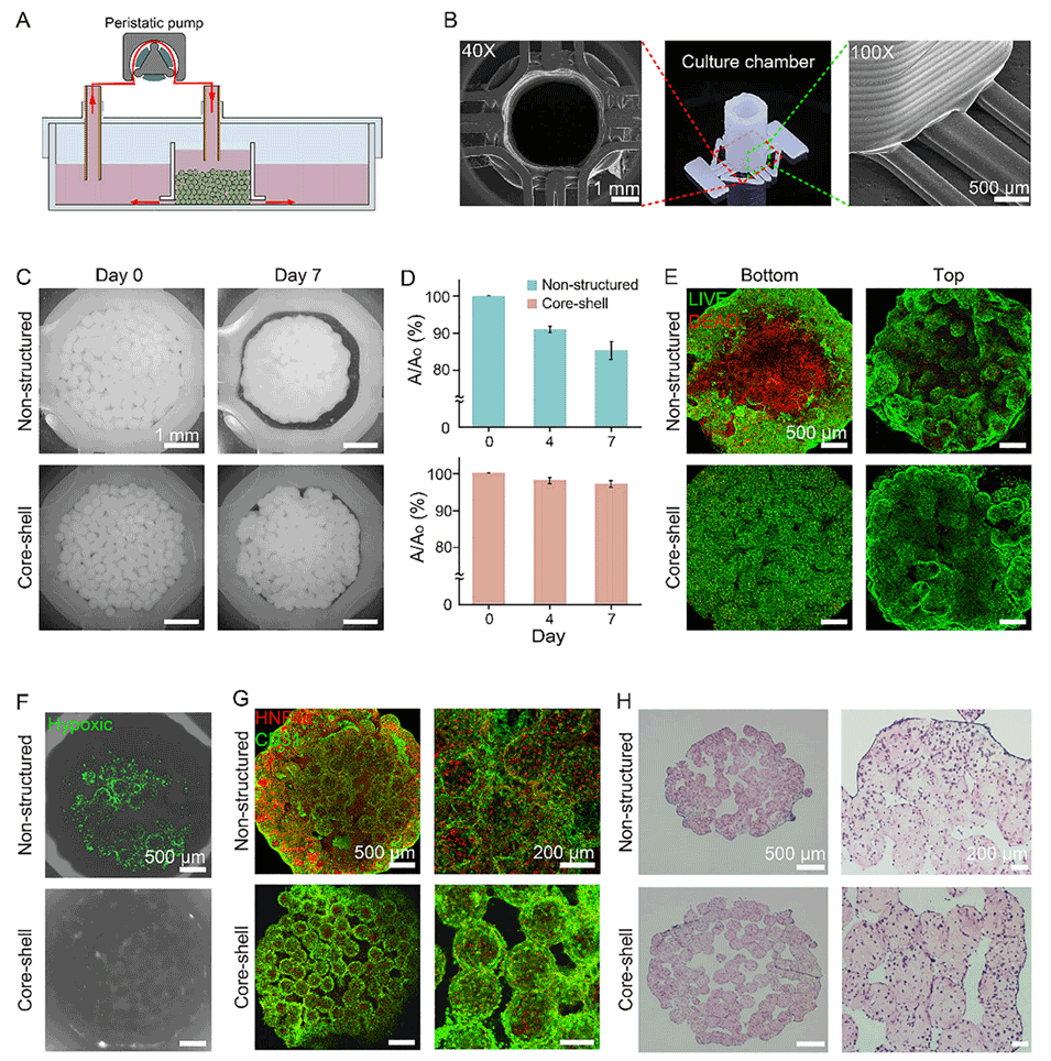 图4. 灌注培养条件下,非结构化与核-壳结构球状微组织构建体的结构差异。A, B)定制化灌注培养系统的示意图,以及 3D 打印聚己内酯(PCL)培养舱的实物图(A)和扫描电子显微镜(SEM)拍摄的培养舱微观结构图像(B)。C)组织构建体底部区域在第 0 天和第 7 天的明场图像。D)底部区域面积随时间变化的定量分析,数据以平均值±标准差(SD)表示(n=3)。E)第 7 天组织构建体顶部和底部区域的活/死染色图像。F)第 7 天组织构建体底部区域的缺氧染色图像。G)第 7 天组织构建体底部区域的免疫荧光染色图像(4 倍和 10 倍放大)。H)第 7 天组织构建体顶部和底部切片的苏木精-伊红(H&E)染色图像。第一行展示非结构化球状微组织构建体的代表性 4 倍和 10 倍放大图像,第二行展示核-壳结构球状微组织构建体的对应图像。