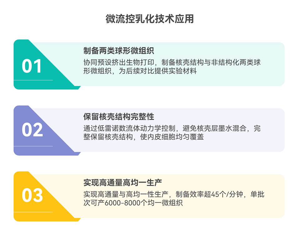 高效制造技术:结合预设挤出生物打印与微流控乳化,实现核壳微组织的高通量生产(>45个/分钟,单批次6000-8000个),且微组织尺寸均一、结构完整(内皮细胞覆盖率>95%);