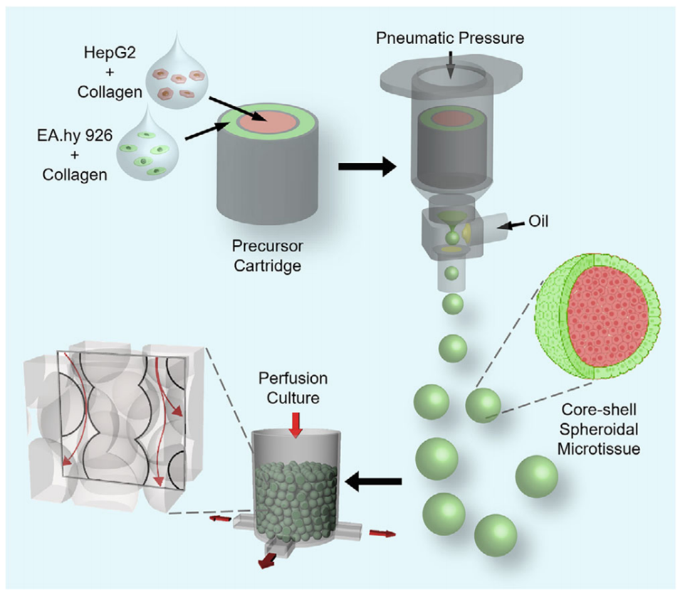 近期,有研究人员通过预设挤出生物打印与微流控乳化技术,成功制备出内皮细胞覆盖的核壳结构球形微组织,并将其组装后结合培养基灌注培养,构建出高血管化、高细胞密度的体积组织,该组织可在体外稳定培养7天,为临床级人工器官的开发提供了关键基础技术。相关研究以“Engineering Volumetric Tissue Analogs via Assembly of Endothelial Cell-Covered Spheroidal Microtissues”为题目,发表于期刊《Advanced Healthcare Materials》。