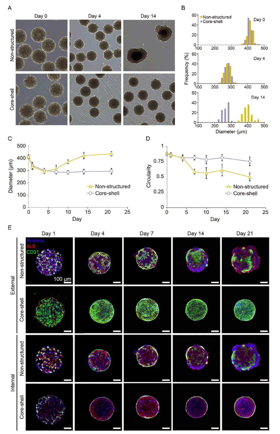 图2. 核-壳结构与非结构化球状微组织的长期结构对比。该对比凸显了二者在形态与稳定性上的差异。A)非结构化与核-壳结构球状微组织在第 0 天、第 4 天和第 14 天的明场显微镜图像。B)直径分布定量分析(n=80)。C)非结构化与核-壳结构球状微组织随时间变化的直径数据(n=30)。D)非结构化与核-壳结构球状微组织随时间变化的圆形度测量结果(n=50)。数据以平均值±标准差(SD)表示。E)第 1 天、第 4 天、第 7 天、第 14 天和第 21 天,非结构化与核-壳结构球状微组织表面及横截面的免疫荧光染色图像。