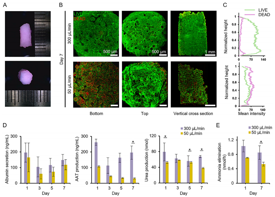 图5. 体积组织的培养结果及培养基灌注速率的影响研究。A)利用核-壳结构球状微组织构建的体积组织结构照片。B)不同培养基灌注速率下,体积组织结构的细胞活力评估。C)活细胞与死细胞沿组织结构高度方向的分布情况。D)组织结构产生白蛋白、α-1 抗胰蛋白酶(AAT)和尿素的能力评估(n=3)。E)不同灌注速率下,核-壳结构球状微组织构建的体积组织从培养基中清除氨的能力对比。数据以平均值±标准差(SD)表示(n=3)。星号表示 300μL/min 组与 50μL/min 组之间存在显著差异(p<0.05)。