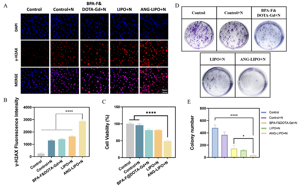 图2.(A)通过 γ-H2AX 染色检测各制剂组经 BNCT 处理后的 DNA 损伤,比例尺:50 μm(给药剂量为 50 μg/mL,注射后 6 小时进行照射);(B)通过 ImageJ 软件对 γ-H2AX 荧光强度进行半定量统计(****p<0.0001);(C)通过 CCK-8 法检测不同药物载体孵育后,BNCT 照射对细胞的毒性作用(****p<0.0001);(D)GL261 细胞经 BNCT 照射后的克隆形成实验结果(****p<0.0001);(E)各组细胞克隆数统计(*p<0.05,****p<0.0001,)。