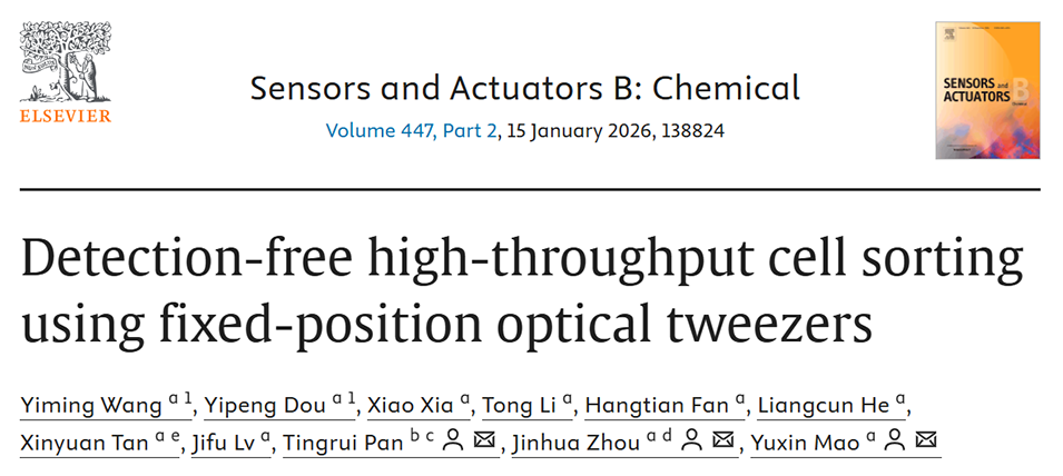 基于光镊的细胞分选技术因其非接触、低损伤的优势而备受关注,但传统方法依赖检测技术识别细胞类型并需动态移动光镊,限制了通量并增加了系统复杂度。近期,安徽医科大学毛宇昕副教授、周金华副教授和中国科学技术大学潘挺睿教授等人开发了一种基于固定位置光镊的无检测高通量细胞分选技术,通过设计带弧形突起的微流控芯片,借助流体动力与光学力协同作用引导目标细胞,在无需检测模块和光镊动态移动的情况下,将理论分选通量提升至10个细胞/秒,同时降低系统复杂度与成本,在粒子分选和癌细胞-红细胞分离实验中展现出高纯度与良好细胞活性。相关研究以“Detection-free high-throughput cell sorting using fixed-position optical tweezers”为题目,发表在期刊《Sensors and Actuators B: Chemical》上。