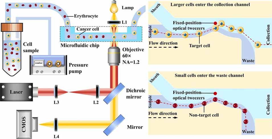 1、本研究结合固定位置的光镊与具有弧形突起的微流控芯片,提出一种免检测、高通量的细胞分选新方法。