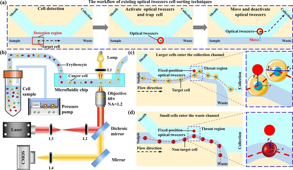 图1:固定位置光镊细胞分选系统示意图。(a) 现有光镊分选方法流程: 需要探测器识别细胞,并动态控制下游光镊进行捕获和移动。(b) 本系统实验装置: 主要由微流控芯片和固定位置的光镊模块组成。(c) 大细胞(目标)进入收集通道: 在流场和光场的共同作用下,大细胞因受到足够的光梯度力而发生偏转,从样品流进入鞘液流,最终进入收集通道。(d) 小细胞(非目标)进入废液通道: 由于尺寸小、离光镊远,所受光学力可忽略,因此留在样品流中进入废液通道。
