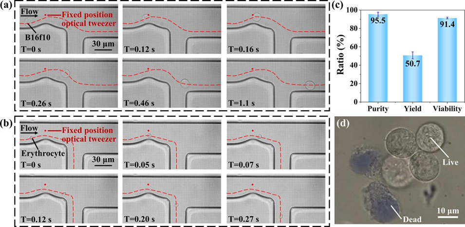 图5:癌细胞与红细胞的分选。(a) B16F10癌细胞(被分选)轨迹: 在光镊和流场作用下,癌细胞被成功引导至收集出口。(b) 红细胞(未被分选)轨迹: 因光学力不足,红细胞直接流入废液出口。(c) 分选纯度、得率和细胞活性: 癌细胞分选纯度达95%,但得率较低(51%);细胞活性保持91%。(d) 台盼蓝染色图: 显示分选后的癌细胞仍保持高活性。