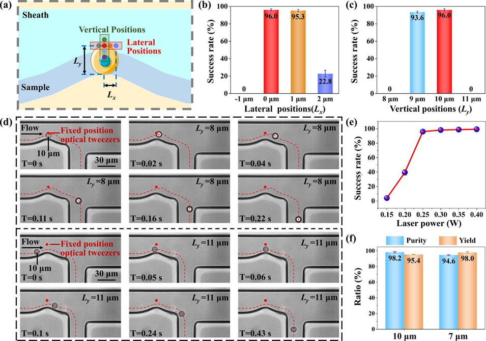 图4:光镊位置和激光功率的优化。(a) 光镊位置定义示意图: 定义了光镊相对于通道边缘的横向(Lx)和纵向(Ly)位置。(b) 横向位置影响: 当Ly固定为10μm时,光镊正对喉道最窄处上方(Lx=0)时分选成功率最高。(c) 纵向位置影响: 当Lx固定为0时,Ly为10μm(等于目标颗粒的最小尺寸)时分选成功率最高。(d) 分选失败案例: Ly太近(8μm)或太远(11μm)都会导致分选失败。(e) 激光功率影响: 功率达到0.25W后,分选成功率趋于稳定。(f) 优化后的分选性能: 在最佳参数下,10μm和7μm颗粒的分选纯度和得率均很高。