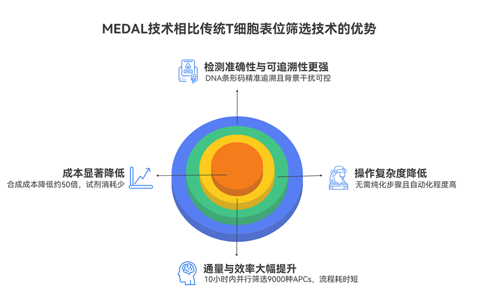 4、实验证明,MEDAL平台不仅能高效评估肽-MHC结合亲和力,还可用于T细胞受体(TCR)模拟抗体筛选及T细胞杀伤实验,显著降低了成本和时间,为疫苗开发和个性化免疫治疗提供了有力工具。