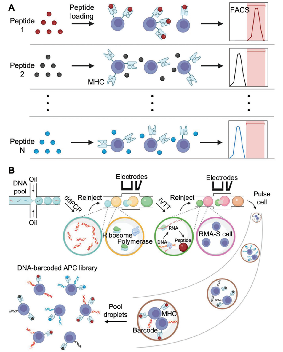 3、构建条形码APC库:将APCs(采用TAP缺陷型RMA-S细胞,避免内源性肽干扰)与含生物素化PCR产物、IVTT合成肽的液滴融合,使APCs同时携带肽-MHC复合物和对应的DNA条形码,破乳后获得文库。