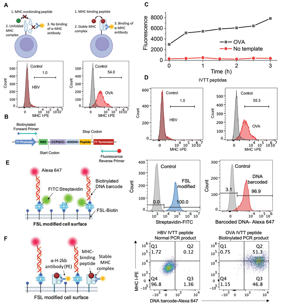 图2. DNA 编码 APC 文库的构建。A)通过肽诱导的 MHC 稳定化实验,验证乙肝病毒(HBV)肽(阴性对照)与卵清蛋白(OVA)肽(阳性对照)在 RMA-S 细胞表面与 H-2Kb MHC 分子的结合情况,本实验使用化学合成肽进行测试。B)用于 PCR-IVTT 反应的 DNA 模板设计图。C)PCR 产物在 IVTT 过程中,ReAsh 荧光信号逐渐累积,表明肽段正在通过酶促反应持续合成。D)在肽诱导的 MHC 稳定化实验中,PCR-IVTT 反应合成的肽段与化学合成肽段效果相当。E)细胞表面 DNA 条形码功能化示意图。直方图显示链霉亲和素与条形码 DNA 几乎完全附着在细胞表面。F)同步检测细胞表面 DNA 条形码与 MHC 分子表达的示意图及结果。