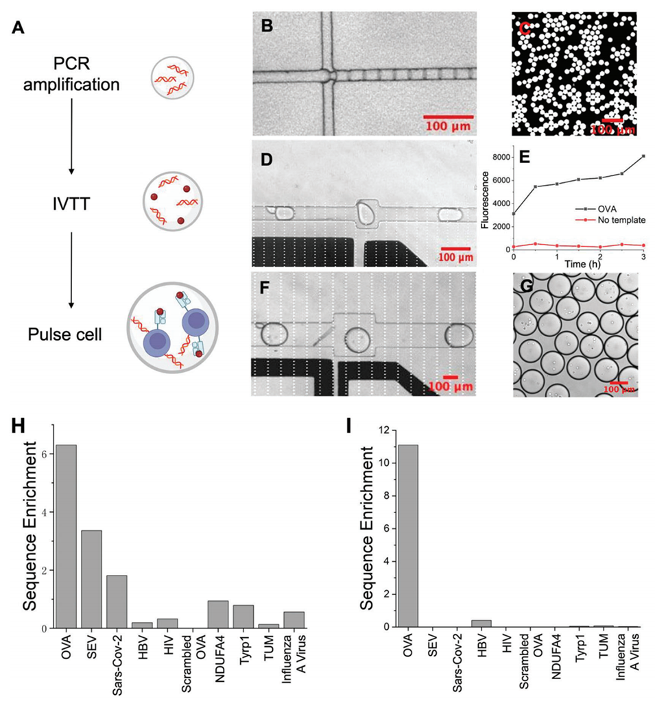 图4. MEDAL 实验验证。A)MEDAL 实验流程示意图。B)液滴 PCR 可实现 DNA 文库在液滴内的数字化扩增。C)显微镜下观察到的经 PCR 扩增后的液滴。D)在电场作用下,PCR 后液滴与 IVTT 试剂液滴发生融合。E)PCR-IVTT 液滴中 ReAsh 染料累积,表明肽段通过酶促反应合成。F)在电场作用下,PCR-IVTT 液滴与含细胞的液滴发生融合。G)融合后,细胞被包裹在含 PCR-IVTT 产物的液滴中。H)利用 MEDAL 对 10 种肽段组成的文库进行同步筛选。Y 轴代表富集率,计算方式为分选后细胞群体与未分选细胞群体的标准化测序读长比值。其中 OVA 肽、仙台病毒(SEV)肽和新冠病毒(SARS-CoV-2)刺突蛋白肽的富集率显著高于其他肽段。I)TCR 模拟抗体(TCRm)与 MEDAL 制备的特定负载肽段 APCs 的结合情况。Y 轴代表富集率,计算方式为分选后细胞群体与未分选细胞群体的标准化测序读长比值。OVA 肽的富集率显著高于其他肽段。