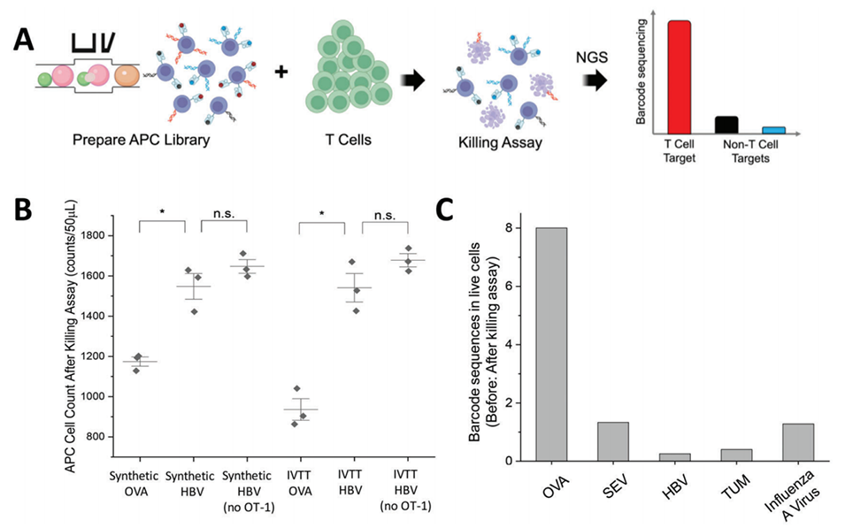 图5. 利用杀伤实验鉴定 T 细胞表位。A)杀伤实验流程示意图。B)杀伤实验的批量验证结果。RMA-S 细胞(即 APCs)经合成肽或 IVTT 合成肽脉冲处理后,与 OT-1 T 细胞共培养。检测培养 4 小时后存活 APCs 的数量。* 表示差异具有统计学意义(p<0.05,单侧 Student t 检验);n.s. 表示差异无统计学意义(p>0.05,单侧 Student t 检验)。C)通过基于液滴的 MEDAL 平台制备含 5 种 APCs 的混合库,将其与 OT-1 T 细胞共培养 4 小时。对杀伤实验前后收集的存活 APCs 进行 DNA 条形码测序。Y 轴代表杀伤前细胞群体与杀伤后细胞群体的标准化测序读长比值。OVA 肽对应的 DNA 条形码比值显著更高,证实在此多重杀伤实验中,负载 OVA 肽的 APCs 被 OT-1 T 细胞特异性杀伤。