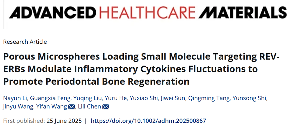 近期,华中科技大学陈莉莉教授、王一帆副教授团队针对牙周炎引发的牙槽骨缺失难题,开发出一种新型多孔微球材料PLGA-S@Gel-SeHA。该材料通过持续释放靶向昼夜节律核受体REV-ERB的小分子STL1267,有效平抑了炎症因子的异常波动,引导巨噬细胞向促修复的M2表型极化,从而在炎症环境下成功实现了牙槽骨的显著再生。相关研究以“Porous Microspheres Loading Small Molecule Targeting REV-ERBs Modulate Inflammatory Cytokines Fluctuations to Promote Periodontal Bone Regeneration”为题,发表于期刊《Advanced Healthcare Materials》。