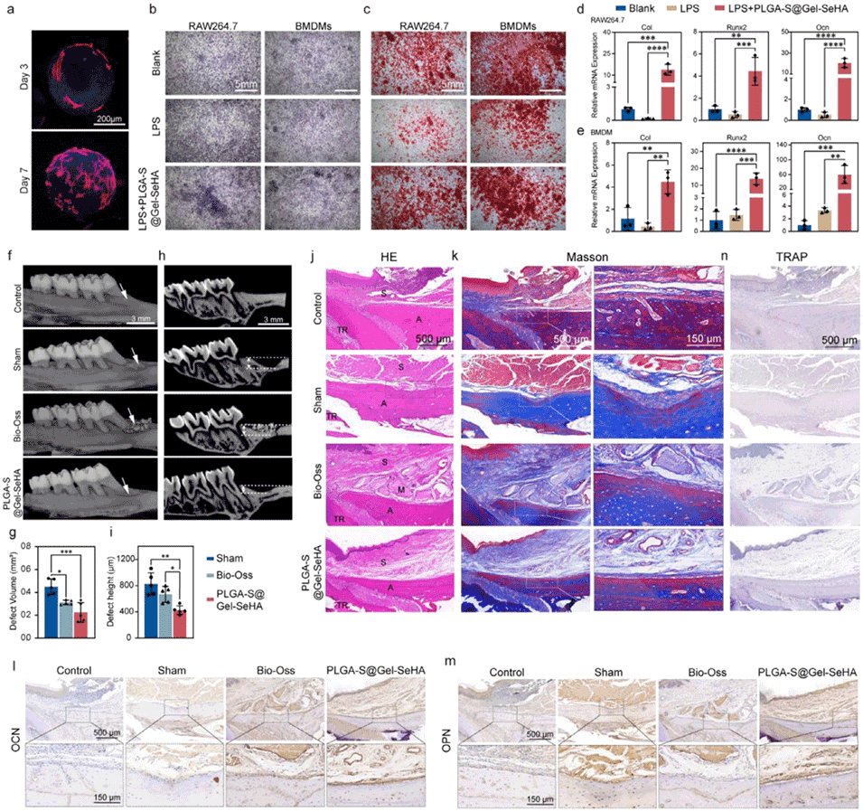 3、Gel-SeHA提供优异的生物矿化活性和成骨诱导能力。负载的STL1267可被持续释放,减轻LPS刺激下炎症细胞因子的剧烈波动,使IL-6、TNF-α和IL-1β等关键因子的表达峰值降低超过30%,并恢复其正常节律性表达,同时促进巨噬细胞向促修复的M2表型极化。