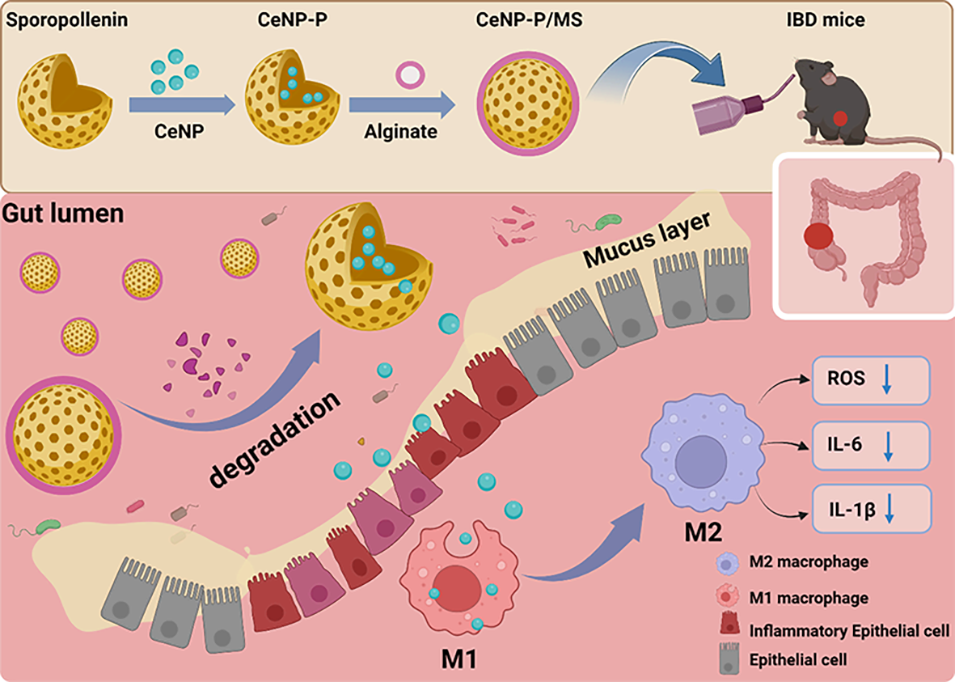 1、本研究开发了一种基于孢子花粉素与氧化铈纳米酶(CeNP)的杂化微球口服递送系统(CeNP-P/MS),用于炎症性肠病(IBD)的治疗。