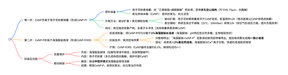 在该研究中,氧化铈纳米酶(CeNP)通过 “两步层级封装” 策略被载入微球(最终形成CeNP-P/MS),核心是先将CeNP负载于孢子花粉素微囊,再通过微流控电喷雾技术将其进一步封装于海藻酸盐微球,具体过程如下: