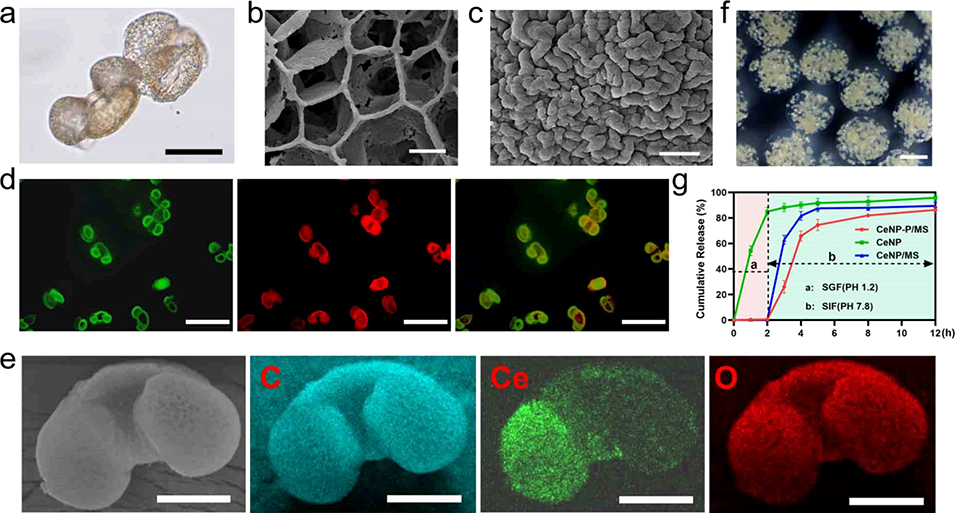 图3. 微米-纳米生物杂化系统的表征。(a)孢子花粉素微囊的明场图像,比例尺20μm;(b, c)孢子花粉素微囊的扫描电子显微镜(SEM)图像,比例尺2μm;(d)异硫氰酸荧光素(FITC)标记的CeNP(绿色)负载于空心松树孢子花粉素微囊(红色)的荧光显微镜图像,比例尺100μm;(e)CeNP-P的SEM-能量色散X射线光谱(EDX)元素映射图,绿色代表Ce元素,红色代表O元素,蓝色代表C元素,比例尺20μm;(f)CeNP-P/MS的明场图像,比例尺200μm;(g)CeNP-P/MS在pH 1.2(模拟胃液)与pH 7.8(模拟肠液)分散体系中CeNP的动态释放曲线。