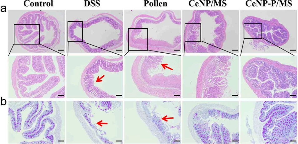 图6. CeNP-P/MS治疗后肠道组织的表征。(a)不同处理组小鼠大肠的苏木精-伊红(H&E)染色结果,箭头指示黏膜层坏死与隐窝结构紊乱,比例尺:左侧400μm,右侧300μm;(b)不同处理组小鼠肠道的过碘酸-希夫(PAS)染色结果,图像为代表性切片,酸性黏蛋白呈蓝色,中性黏蛋白呈品红色,箭头指示杯状细胞缺失与黏蛋白含量减少,比例尺400μm。