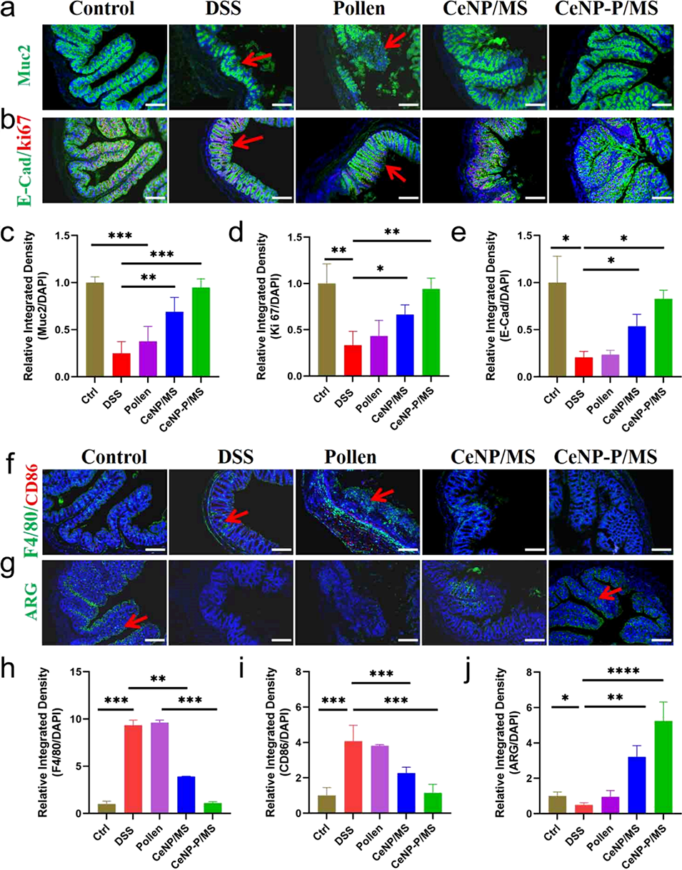 图7. CeNP-P/MS治疗后肠道组织的表征。(a, c)不同处理组小鼠肠道中黏液屏障标志物黏蛋白2(Muc2)的免疫染色结果(a)与定量分析(c),绿色代表Muc2或E-钙黏蛋白(E-Cad),红色代表Ki67(细胞增殖标志物),蓝色代表细胞核;(b)不同处理组小鼠肠道中Ki67与E-钙黏蛋白的免疫染色结果;(d, e)肠道组织中Ki67与E-钙黏蛋白荧光信号的定量分析;(f, g)不同处理组小鼠肠道中巨噬细胞标志物的免疫荧光染色结果,绿色代表F4/80或精氨酸酶(ARG,M2型巨噬细胞标志物),红色代表CD86(M1型巨噬细胞标志物),蓝色代表细胞核;(h-j)不同表型巨噬细胞荧光信号的定量分析。所有图像比例尺均为400μm。