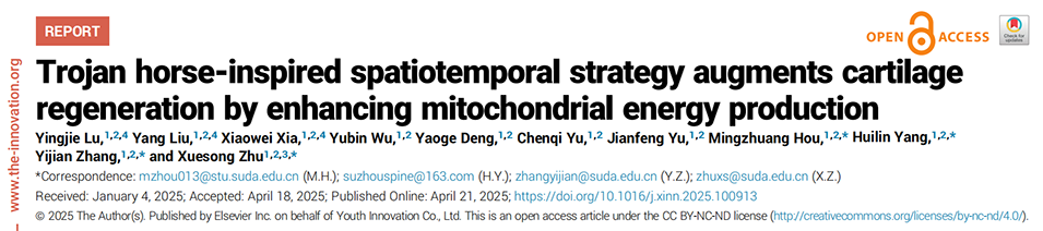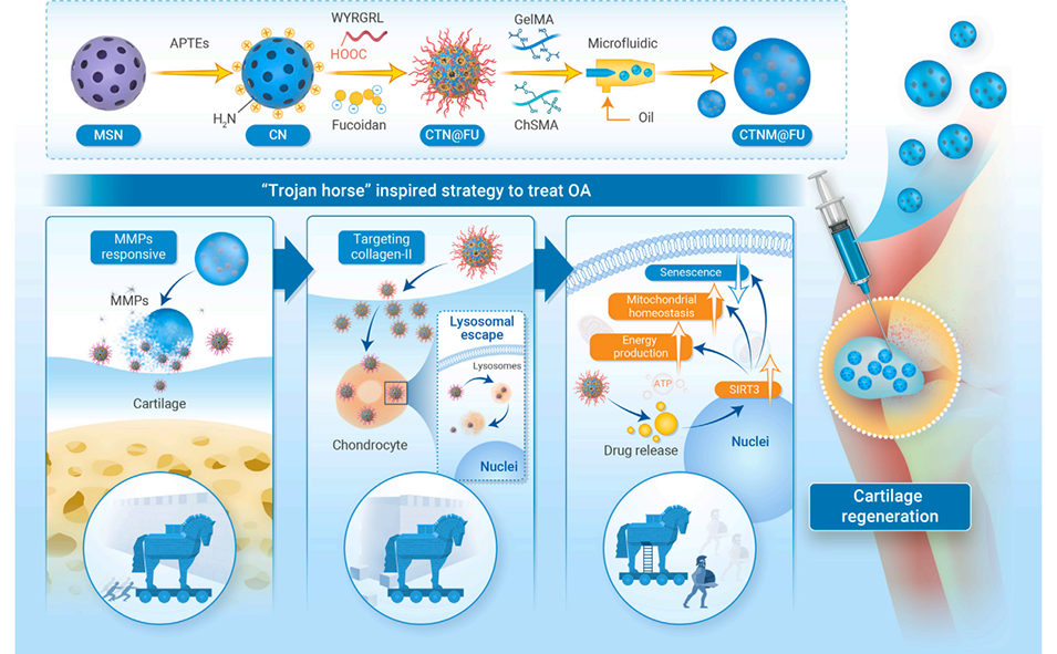 近期,苏州大学骨科研究所朱雪松教授、张一健医生、杨惠林教授、侯明壮博士等人成功开发了一种受“特洛伊木马”启发的智能药物递送系统。该体系通过微流控技术构建了载药水凝胶微球,能像“特洛伊木马”一样分三步精准地将褐藻多糖硫酸酯递送至软骨病灶内部,并通过激活SIRT3显著增强软骨细胞的线粒体能量代谢,最终有效延缓了骨关节炎的进展并促进了软骨再生。相关研究以“Trojan horse-inspired spatiotemporal strategy augments cartilage regeneration by enhancing mitochondrial energy production”为题目,发表于期刊《The Innovation》。