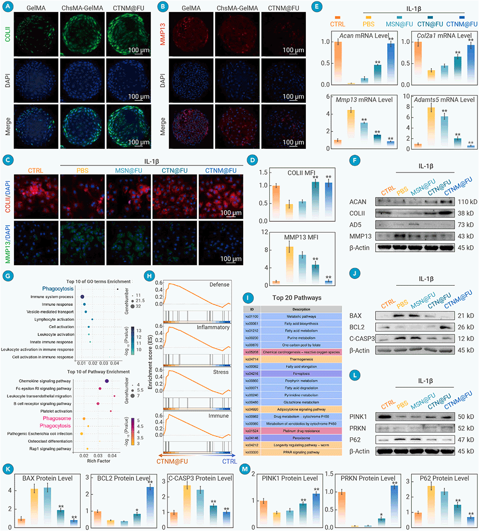 图2. CTNM@FU通过抑制线粒体凋亡并促进线粒体自噬,进而促进软骨合成代谢