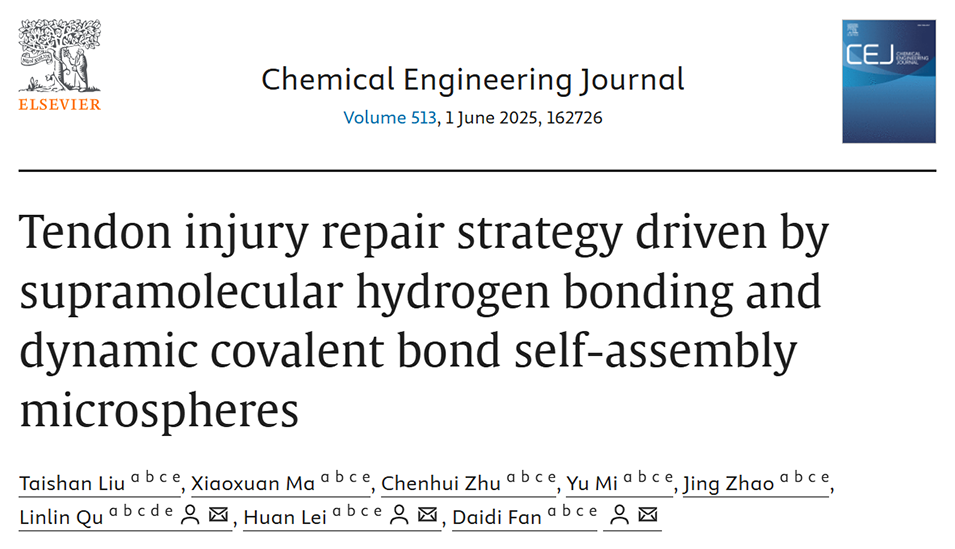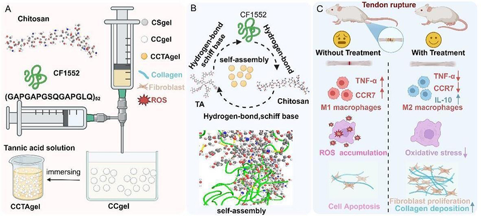 肌腱损伤是骨科常见病症,通常会导致局部功能障碍和生活质量下降。由于肌腱组织代谢活性低且损伤部位存在炎症微环境,其愈合过程往往不会太理想。近期,西北大学范代娣教授、雷桓副教授、屈琳琳副教授等人开发了一种基于壳聚糖-胶原-单宁酸(CCTA)的超分子自组装微球。该微球利用微流控技术制备,兼具优异的抗氧化与抗炎能力,能有效调控损伤部位的炎症微环境,在大鼠模型中显著促进了肌腱的再生与功能恢复。相关研究以“Tendon injury repair strategy driven by supramolecular hydrogen bonding and dynamic covalent bond self-assembly microspheres”为题目,发表在期刊《Chemical Engineering Journal》上。