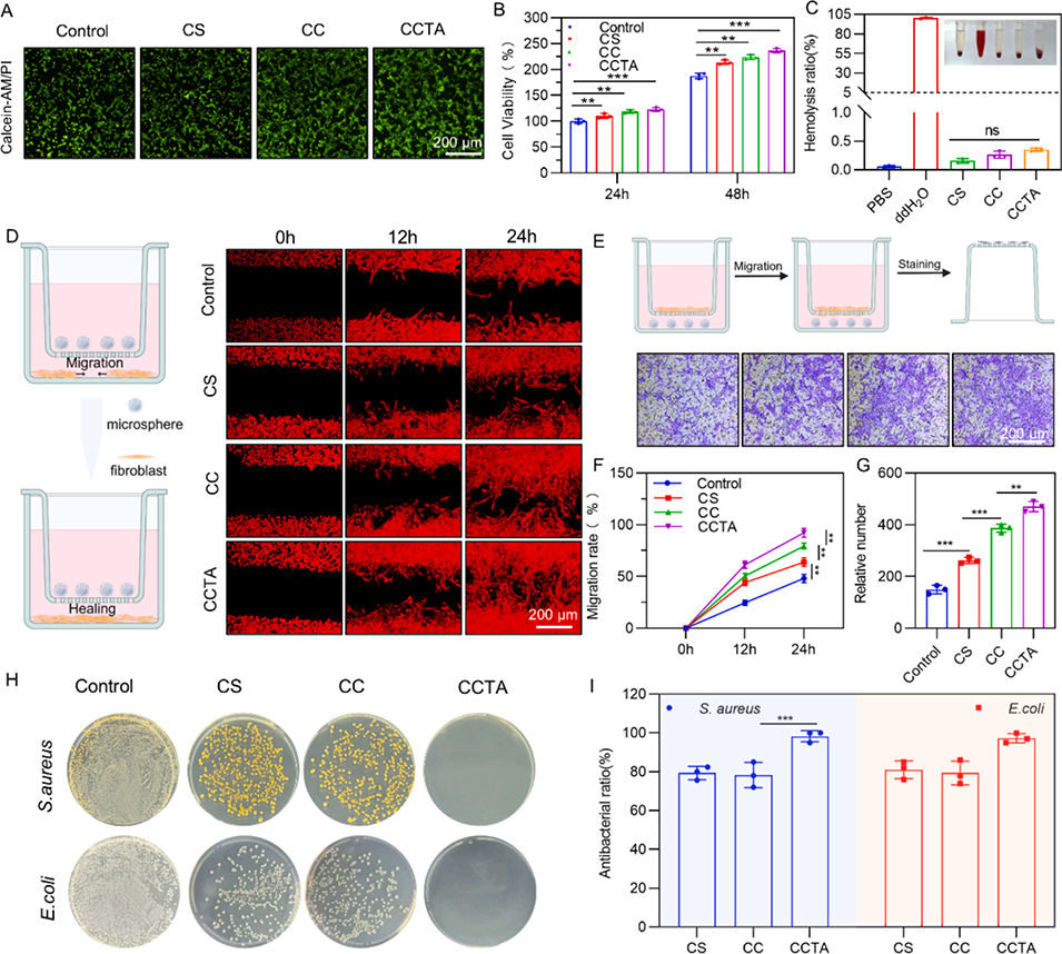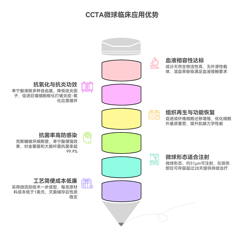 2、CCTA微球以生物活性成分直接自组装,避免了外源性载体潜在毒性,兼具高生物相容性、抗氧化和抗炎性能。