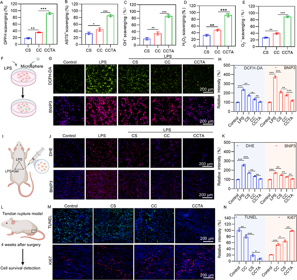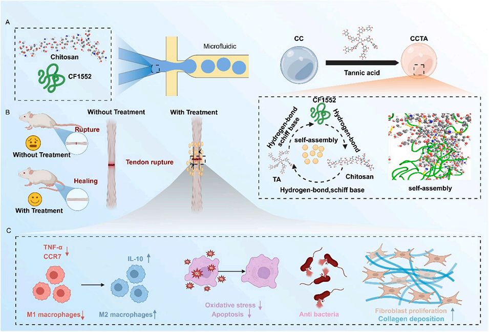 Scheme1:CCTA微球制备与应用示意图。A)采用微流控技术制备CCTA微球,壳聚糖、CF1552与单宁酸通过氢键发生交联与组装;B)将CCTA微球应用于大鼠肌腱断裂模型;C)CCTA微球可有效抑制氧化应激与炎症反应,兼具抗菌性能,同时促进细胞外基质(ECM)重塑。