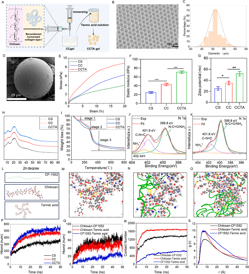 1、本研究采用微流控技术制备了壳聚糖-胶原-单宁酸(CCTA)超分子自组装微球,通过氢键和动态席夫碱共价键实现交联。分子动力学模拟、XRD、FTIR、XPS等分析证实了其自组装机制。