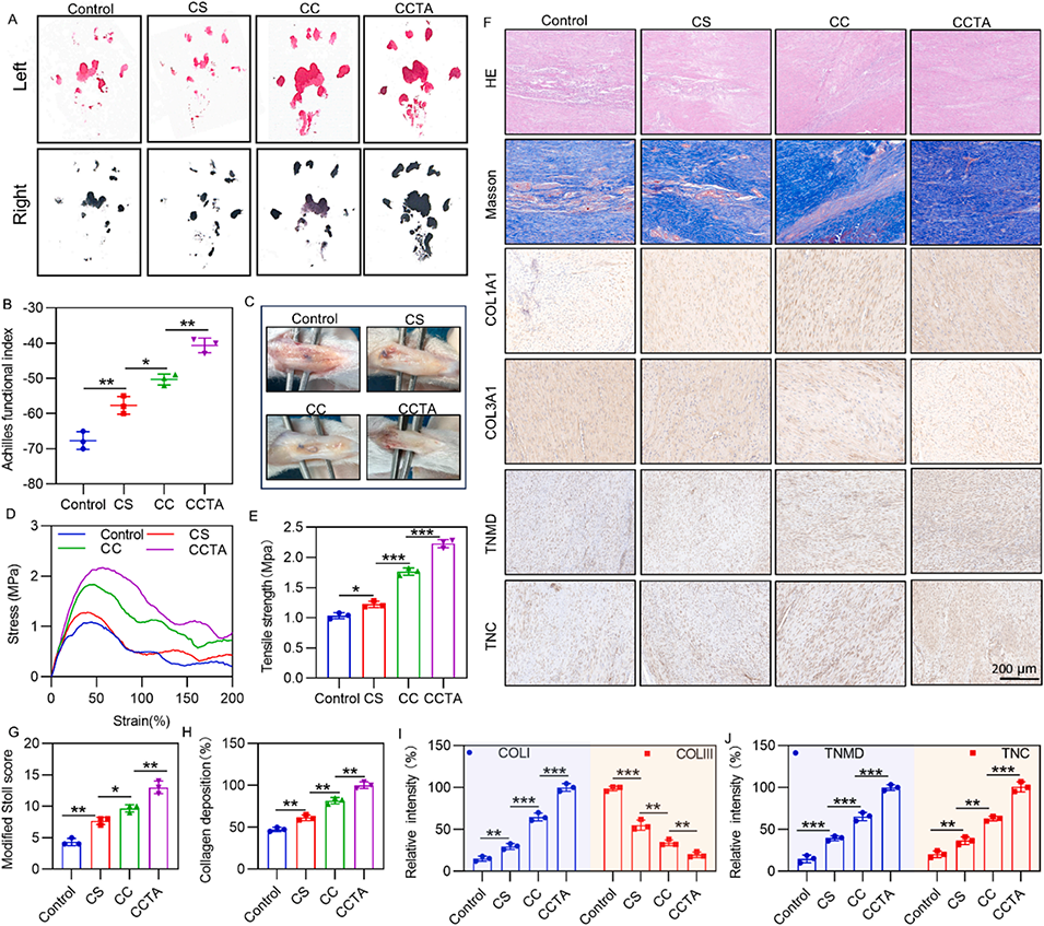 3、在大鼠肌腱损伤模型中,CCTA显著提升肌腱力学强度、减轻氧化应激与炎症,并促进细胞外基质重塑与肌腱再生。