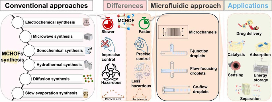 金属有机框架(MOFs)、共价有机框架(COFs)和氢键有机框架(HOFs)(统称MCHOFs)在催化、药物递送、分离和吸附等领域应用广泛。然而,传统合成方法存在动力学缓慢、反应条件控制不精确、产物粒径分布宽及重复性差等问题。微流控合成作为一种绿色高效的替代方案,能精确控制反应条件和产物性能,显著缩短合成时间至分钟级,并减少废物生成。