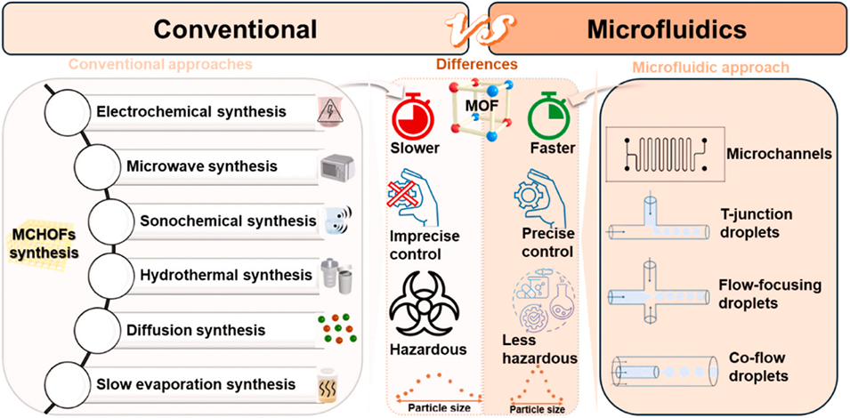 图2. MCHOFs合成中传统方法与微流控技术的对比:方法与性能