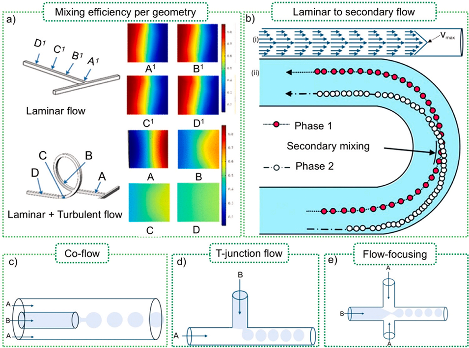 图4.(a)线性与螺旋结构器件的混合效果;(b)转折点处从层流到二次流的转变;微液滴形成方法:(c)共流法、(d)T型结设计及(e)流动聚焦设计