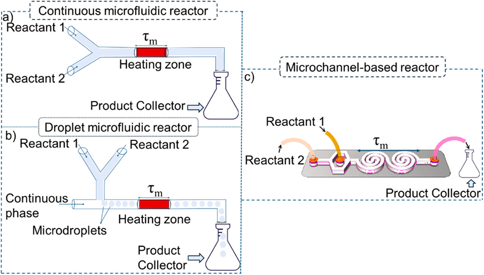 图5.(a)连续微流控反应器;(b)液滴微流控反应器;(c)微通道反应器