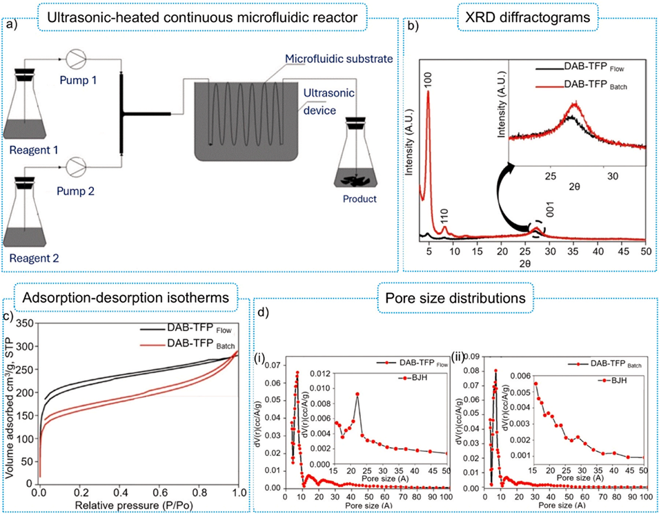 图11.(a)超声波辅助微流控反应器;(b)DAB-TFP的X射线衍射图谱(连续流动合成与间歇式合成对比);(c)DAB-TFP的吸附-脱附等温线(连续流动合成与间歇式合成对比);(d)DAB-TFP的BJH孔径分布(连续流动合成与间歇式合成对比)