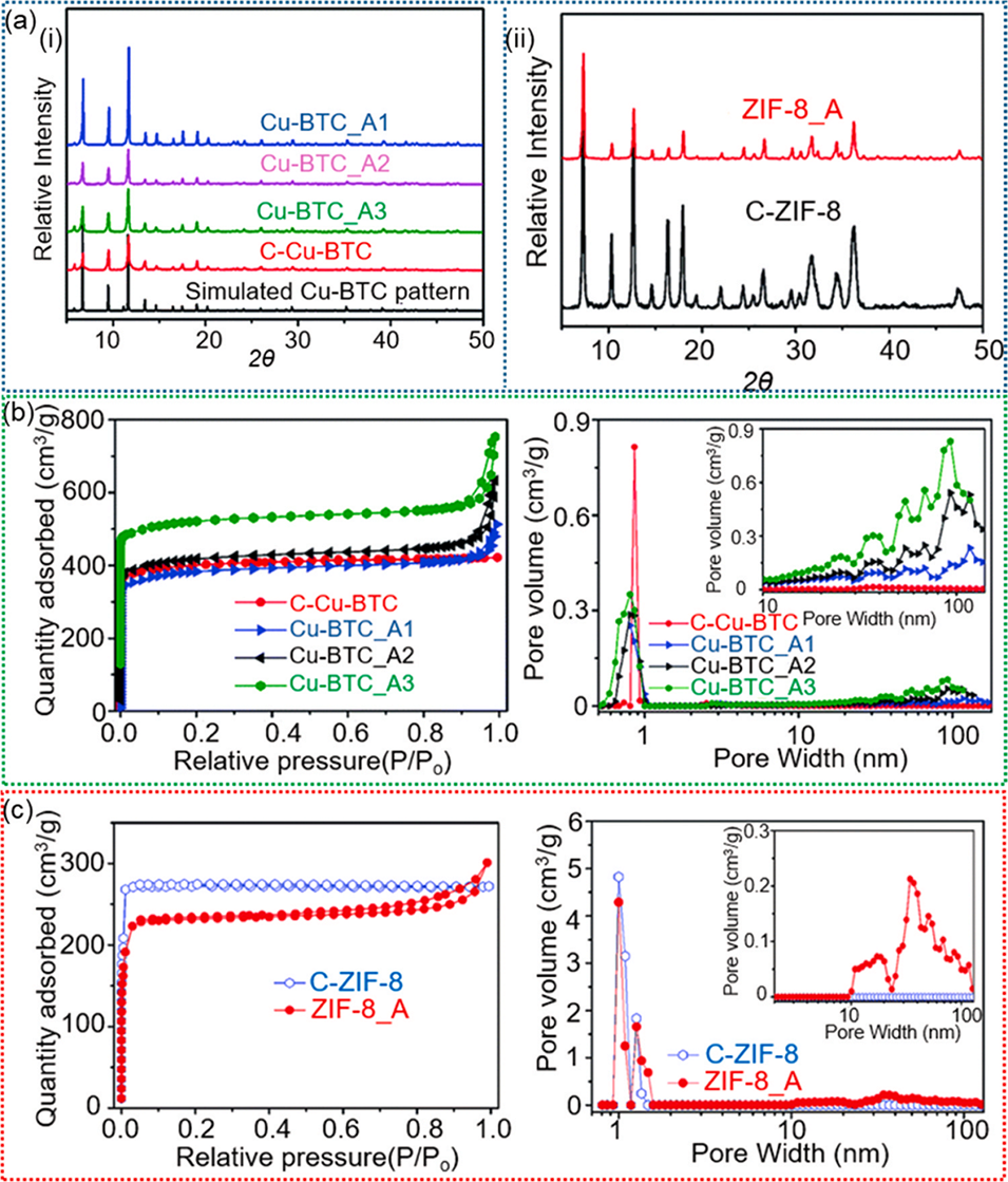 图13.(a)传统材料与(i)分级孔Cu-BTC、(ii)分级孔ZIF-8的X射线衍射图谱;(b)分级孔Cu-BTC的吸附-脱附等温线及BJH孔径分布;(c)分级孔ZIF-8的吸附-脱附等温线及BJH孔径分布
