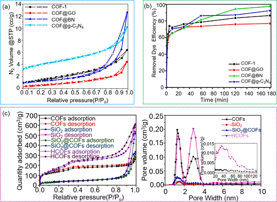 图15. 传统COFs与分级孔COFs对比:(a)COF-1及其衍生物的吸附-脱附等温线;(b)COF-1及其衍生物的染料去除效率;(c)传统COFs、分级孔COFs(HCOFs)与SiO2的吸附-脱附等温线及BJH孔径分布