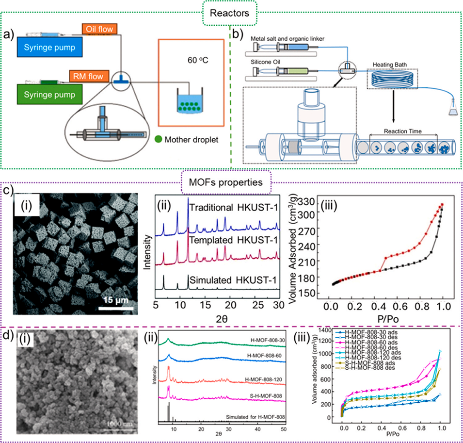 图14.(a)部分液滴微流控反应器;(b)液滴微流控反应器;(c)微流控制备HKUST-1的MOFs性能:(i)扫描电子显微镜(SEM)图像、(ii)X射线衍射图谱、(iii)吸附-脱附等温线;(d)MOF-808的性能:(i)扫描电子显微镜(SEM)图像、(ii)X射线衍射图谱、(iii)吸附-脱附等温线