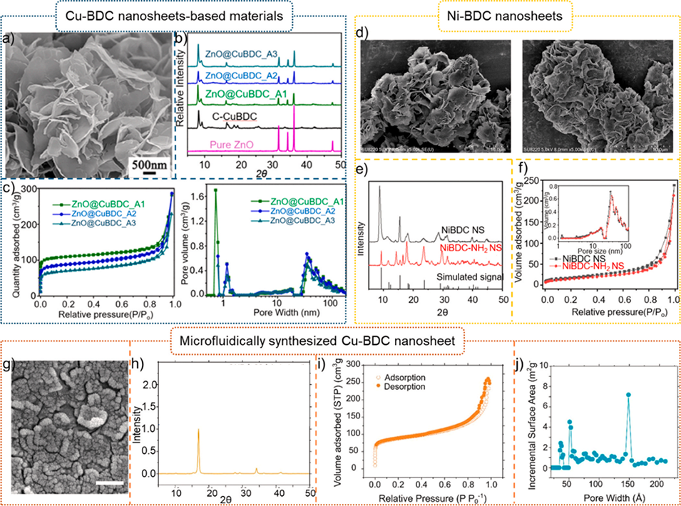 图16.(a)纳米片的扫描电子显微镜(SEM)图像;(b)负载型CuBDC的X射线衍射图谱;(c)负载型CuBDC的吸附-脱附等温线及BJH孔径分布;(d)NiBDC与NiBDC-NH2纳米片的扫描电子显微镜(SEM)图像;(e)NiBDC与NiBDC-NH2纳米片的X射线衍射图谱;(f)NiBDC与NiBDC-NH2纳米片的吸附-脱附等温线及BJH孔径分布;(g)微流控制备Cu-BDC纳米片的扫描电子显微镜(SEM)图像;(h)微流控制备Cu-BDC纳米片的X射线衍射图谱;(i)微流控制备Cu-BDC纳米片的吸附-脱附等温线;(j)微流控制备Cu-BDC纳米片的BJH孔径分布