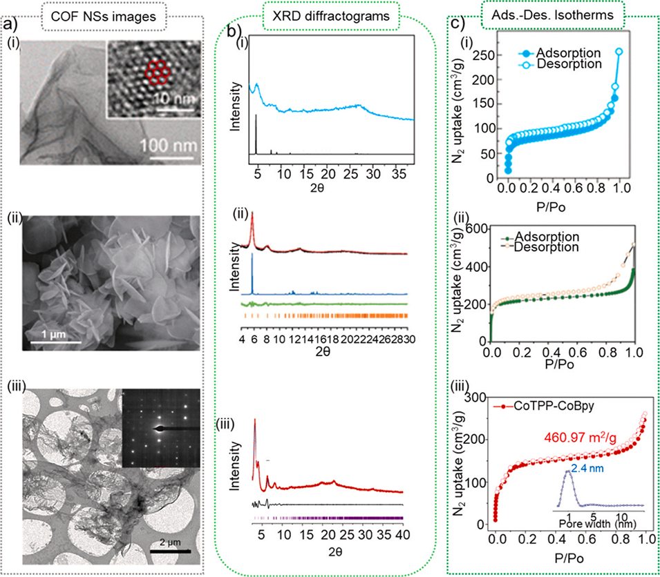 图17. 不同溶剂热法合成COFs的(a)扫描电子显微镜(SEM)图像;(b)X射线衍射图谱;(c)吸附-脱附等温线