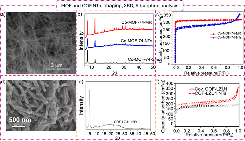 图19.(a)MOF-74纳米管的扫描电子显微镜(SEM)图像;(b)传统MOF-74与MOF-74纳米管的X射线衍射图谱;(c)传统MOF-74与MOF-74纳米管的吸附-脱附等温线;(d)COF-LZU-1纳米管的扫描电子显微镜(SEM)图像;(e)COF-LZU-1纳米管的X射线衍射图谱;(f)传统COF-LZU-1与COF-LZU-1纳米管的吸附-脱附等温线