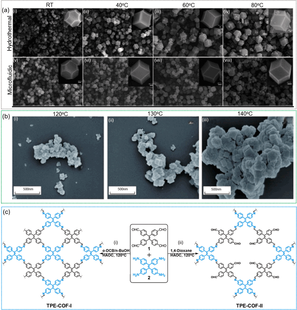 图20. (a)ZIF-8微流控与水热合成中,反应温度从室温(RT)升至80℃的影响;(b)UiO-66微流控合成中,反应温度从120℃升至140℃的影响;(c)溶剂对COFs拓扑结构的影响