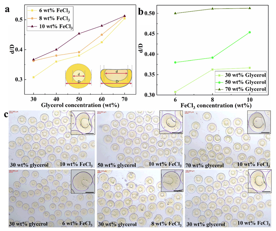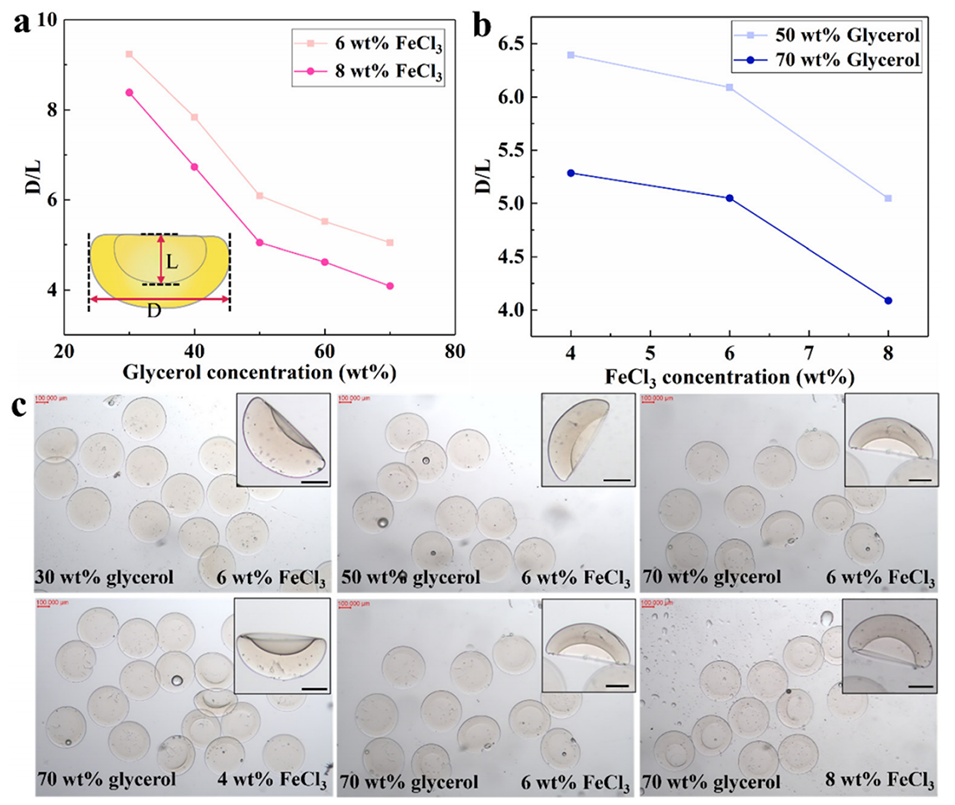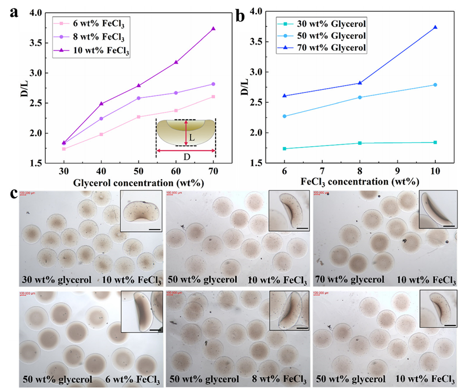 图5. a)在FeCl3浓度固定为4、6、8 wt%时,海藻酸铁微凝胶的D/L值随甘油浓度变化的曲线。插图标示了D(微凝胶水平长度)和L(微凝胶厚度)的定义。b)在甘油浓度固定为30、50、70 wt%时,海藻酸铁微凝胶的D/L值随FeCl3浓度变化的曲线。c)光学显微镜图像展示了在不同甘油和FeCl3浓度下,微凝胶整体尺寸增大、厚度减小的形态变化,与D/L值的变化趋势一致。