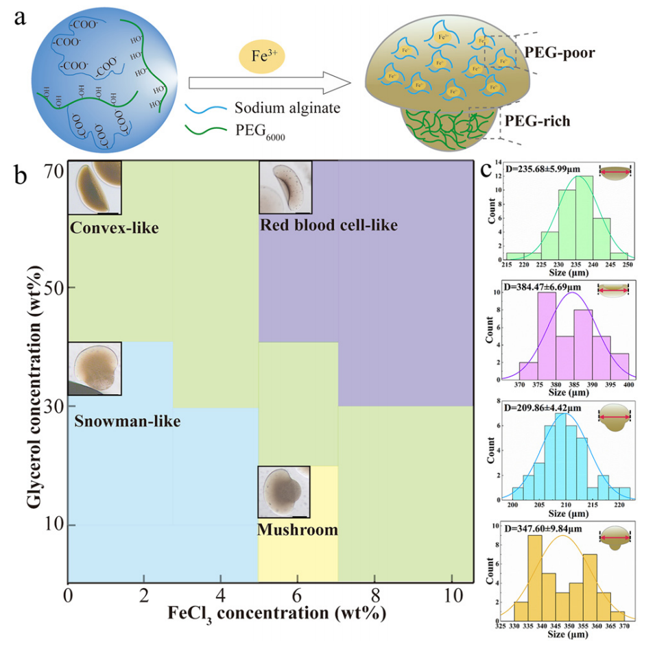 图4. a)展示海藻酸铁微凝胶中特定相分离机制的示意图。b)海藻酸铁微凝胶的形貌相图,该微凝胶在甘油浓度为0~70 wt%、FeCl3浓度为2~10 wt%的收集液中生成,其中内相为含10 wt%聚乙二醇6000(PEG6000)的2 wt% SA水溶液。插图为不同形貌海藻酸铁微凝胶的光学显微镜图像,分别为凸状、红细胞状、雪人状和蘑菇状。所有图的比例尺均为100 μm。c)四种不同形貌海藻酸铁微凝胶的粒径分布图。