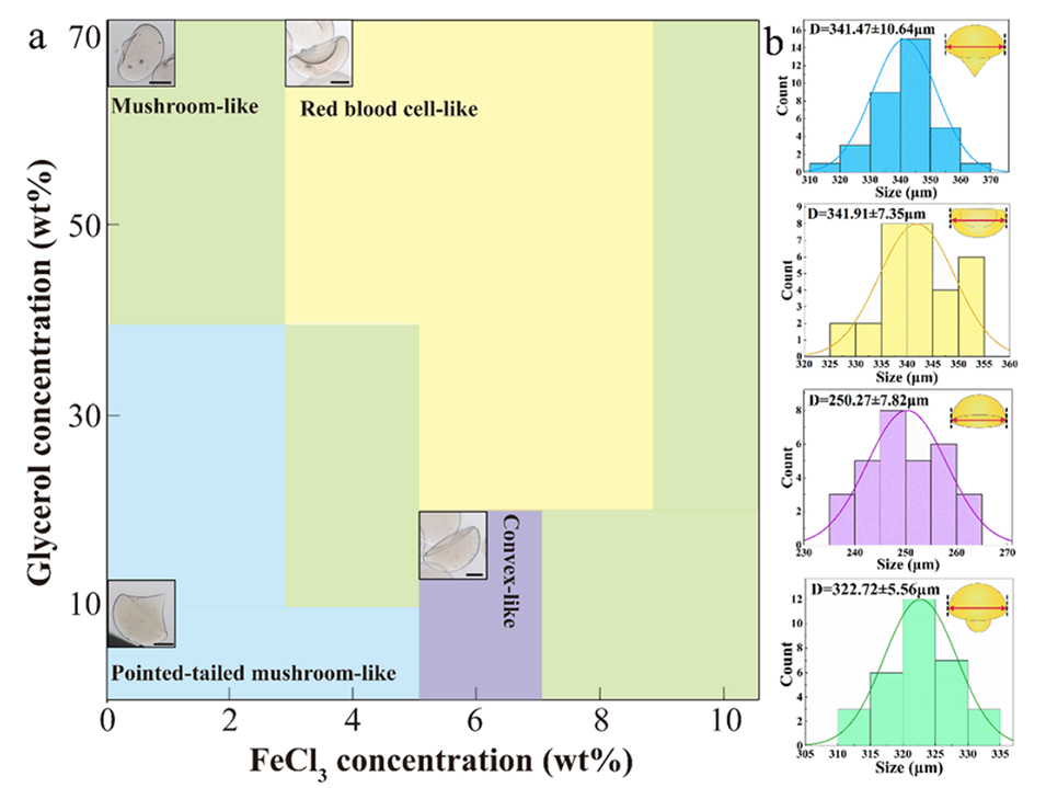 图6. a)以DP为含10 wt%甘油的SA溶液为例,展示了在甘油(0–70 wt%)和FeCl3(2–10 wt%)浓度变化的收集液中生成的海藻酸铁微凝胶的形态相图。插图为四种不同形态的光学显微镜图像:尖尾蘑菇状、红细胞状、蘑菇状和凸透镜状。b)四种形态的海藻酸铁微凝胶的粒径分布图。