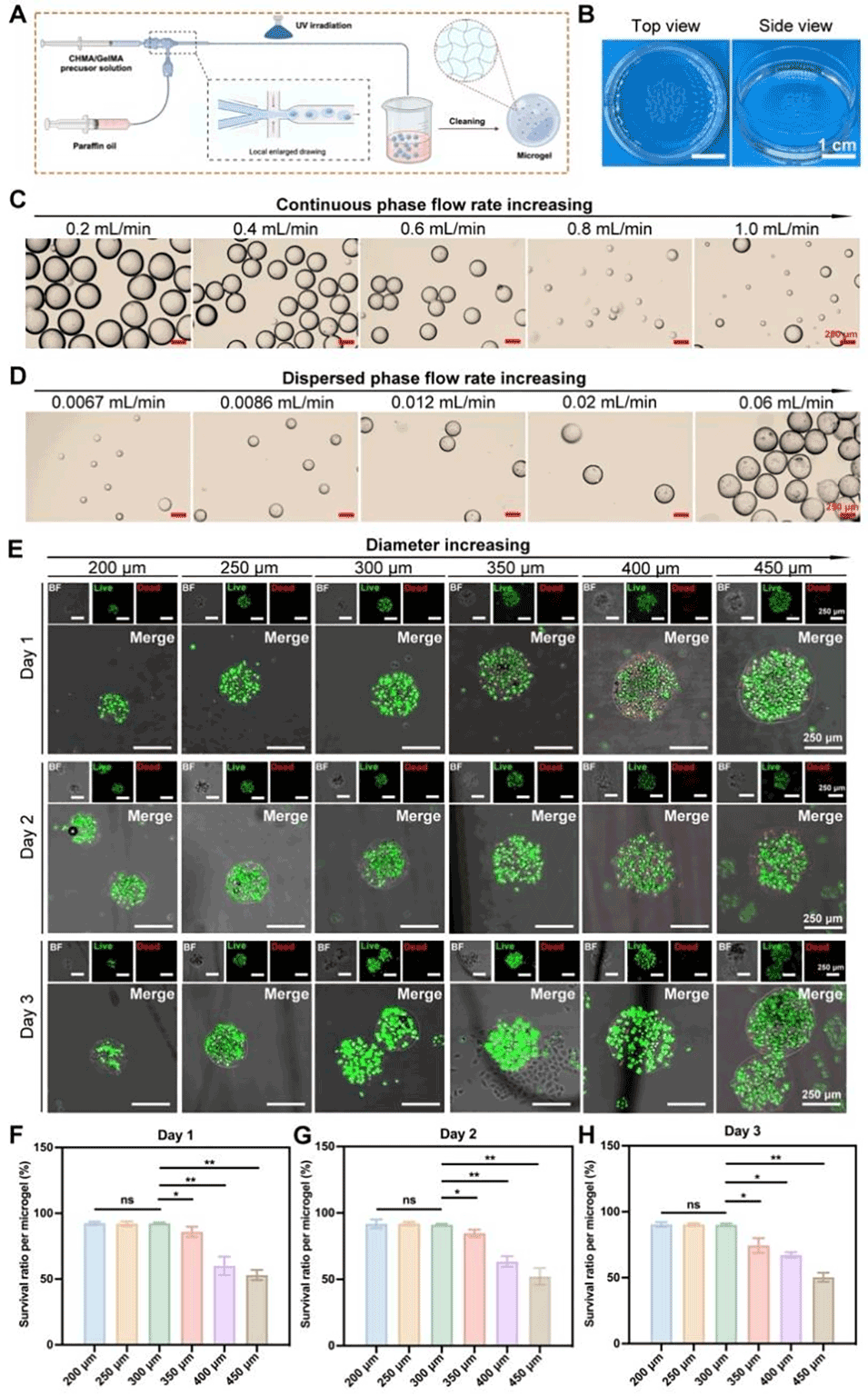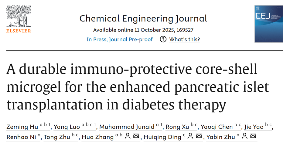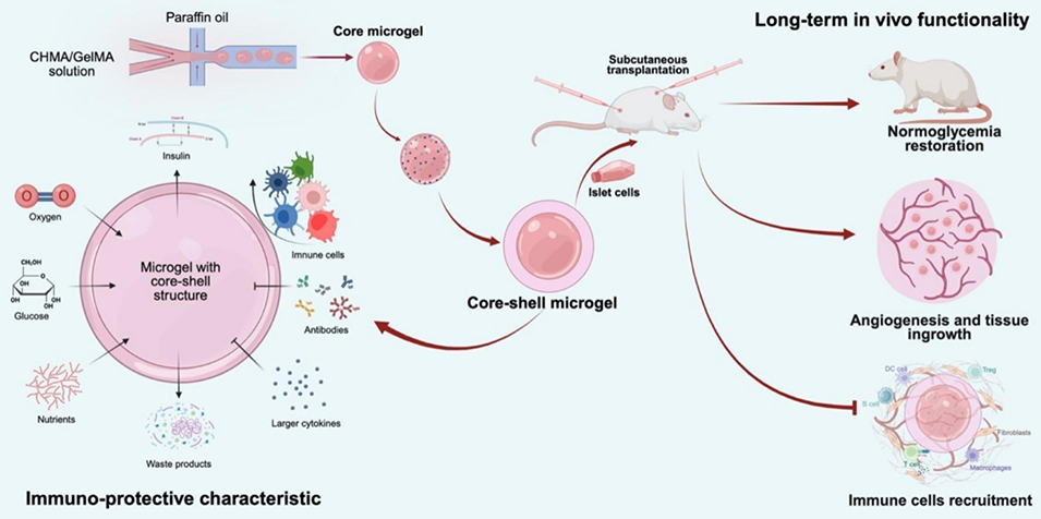 近期,宁波大学医学部竺亚斌教授团队开发了一种核壳结构的免疫保护性微凝胶,其以甲基丙烯酰化明胶(GelMA)和甲基丙烯酰化壳聚糖(CHMA)为核心、聚乙二醇二丙烯酸酯(PEGDA)和海藻酸盐(Alg)为壳层,通过自制微流控装置制备而成。该微凝胶可有效阻断免疫成分侵袭并保障营养交换,不仅在体外实现胰岛细胞长期存活与葡萄糖响应性胰岛素分泌,还能在糖尿病大鼠皮下移植后维持血糖正常达60天,同时促进血管生成与组织整合。相关研究以“A durable immuno-protective core-shell microgel for the enhanced pancreatic islet transplantation in diabetes therapy”为题目,发表于期刊《Chemical Engineering Journal》。