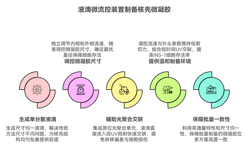 胰岛移植作为β细胞替代疗法之一,虽有望恢复天然胰岛素分泌功能,但面临供体不足、移植后细胞存活率低,以及需长期免疫抑制(易引发感染、癌变等风险)的核心挑战,即便干细胞衍生β细胞也需应对免疫破坏问题。细胞封装技术虽能通过半透膜隔离移植细胞与宿主免疫系统,但传统大胶囊存在营养扩散差等问题,而核壳微凝胶因兼具细胞支撑与免疫保护功能更具潜力,只是传统制备方法难控尺寸且易损伤细胞,材料也需平衡生物相容性与免疫隔离性,这些均为亟待解决的关键问题。