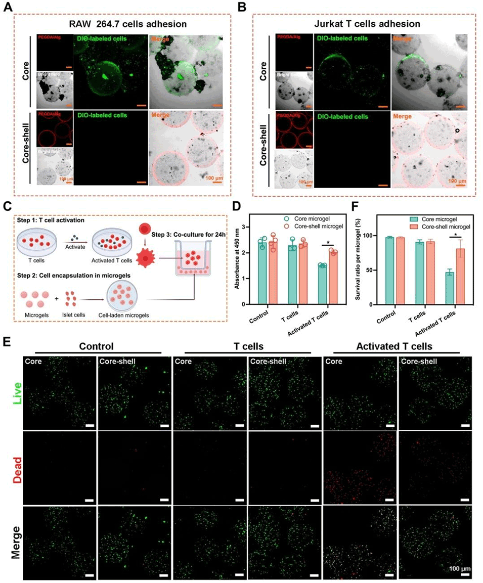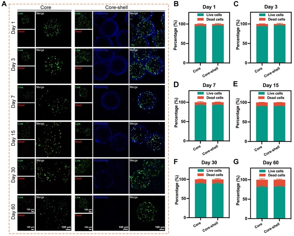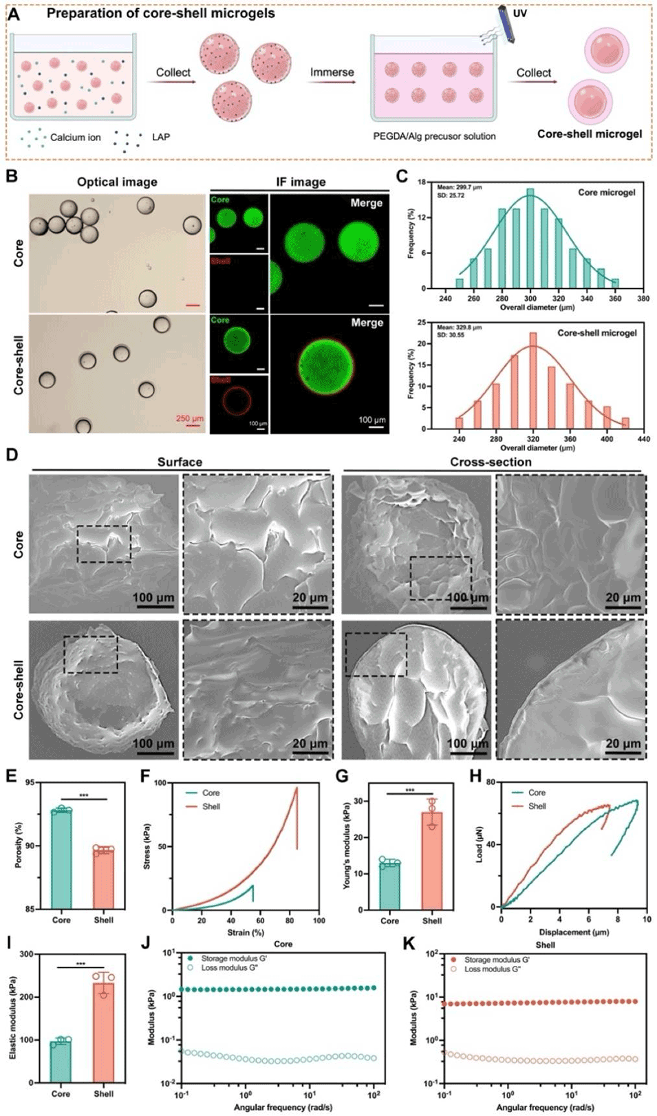 该核壳微凝胶材料设计遵循 “天然聚合物支撑细胞功能 + 合成聚合物实现免疫保护” 的协同逻辑: